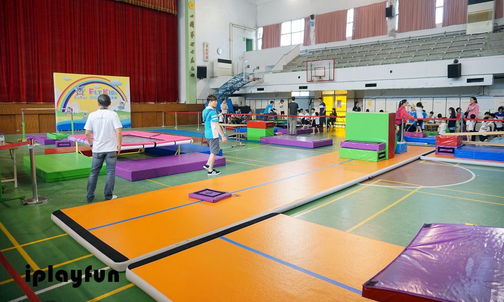 除了體操比賽,還有「歡樂親子大挑戰」除了比完成速度更挑戰體力與體操專業度,一連八道關卡,需要完成合力前行、兩人手推車、彈翻床跳躍等一系列體操挑戰。飛奇兒教練團隊擁有40餘名專業師資,皆畢業於體育專業校、系,亦在體操界中有亮眼表現。